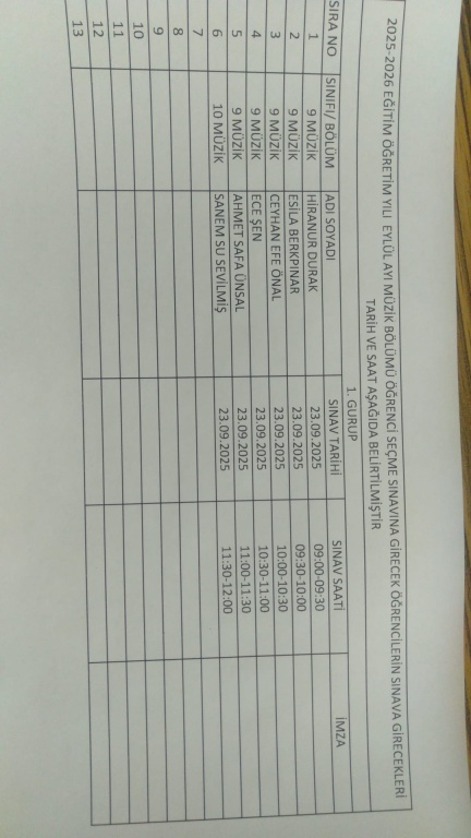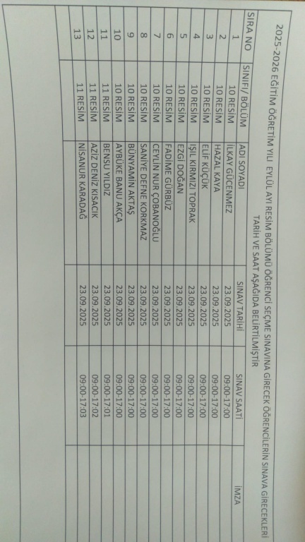 Önemli ! Yetenek sınavına başvurmuş olup listede ismi olmayan öğrencilerin 22 Eylül 2025 pazartesi günü gerekli evraklarla birlikte okul müdürlüğüne başvurmaları önlemle rica olunur.